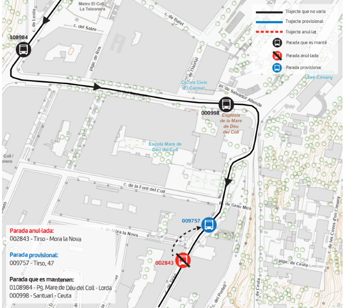 A partir de dimarts 16 de setembre de 2025 i fins a nou avís, parada Tirso - Mora la Nova de Barcelona anul·lada provisionalment.