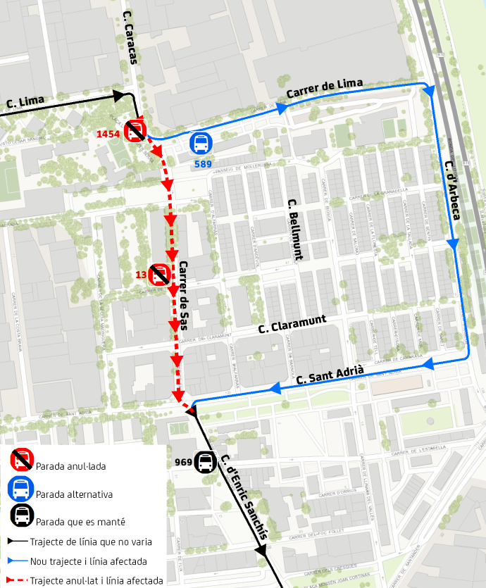 A partir de dilluns 20 d’octubre de 2025 a partir de les 22:00 hores i fins divendres 21 de novembre de 2025, es modifica el recorregut habitual al carrer Sas de Barcelona amb l’anul·lació de les parades afectades.