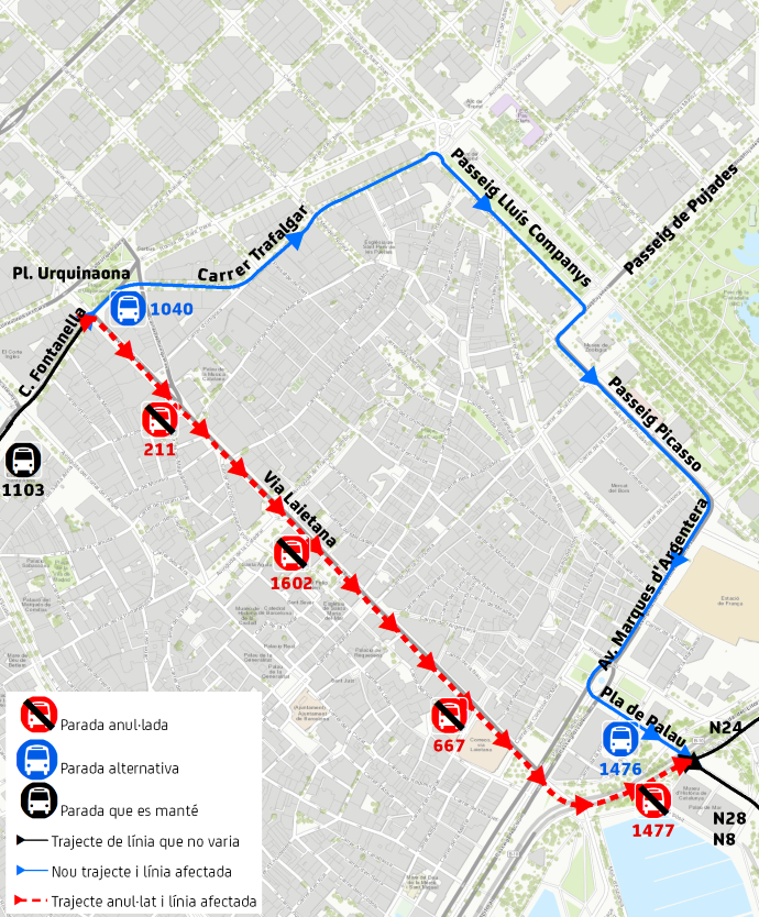 El diumenge 19 d’octubre de 2025 a les 20:00 i fins a les 23:00 aproximadament, es modifica el recorregut habitual a la Via Laietana sentit mar de Barcelona amb l’anul·lació provisional de les parades afectades.