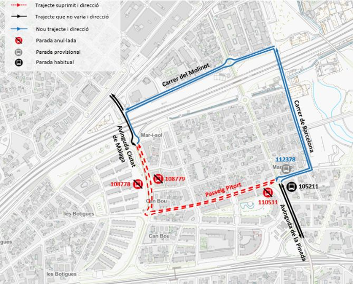 A partir de dimecres 15 d'octubre de 2025 des de les 10:00 hores i fins a les 14:00 hores aproximadament, es modifica el recorregut habitual al passeig del Pitort de Castelldefels amb l'anul·lació provisional de les parades afectades.