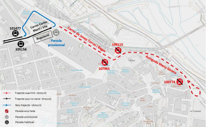 El dilluns 20 d'octubre a les 09:30 i fins al divendres 24 d'octubre de 2025 a les 20:00 aproximadament, es modifica provisionalment el recorregut habitual a l'avinguda Maria Girona de Sant Boi de Llobregat a causa de obres al carrer amb l'anul·lació provisional de les parades afectades.