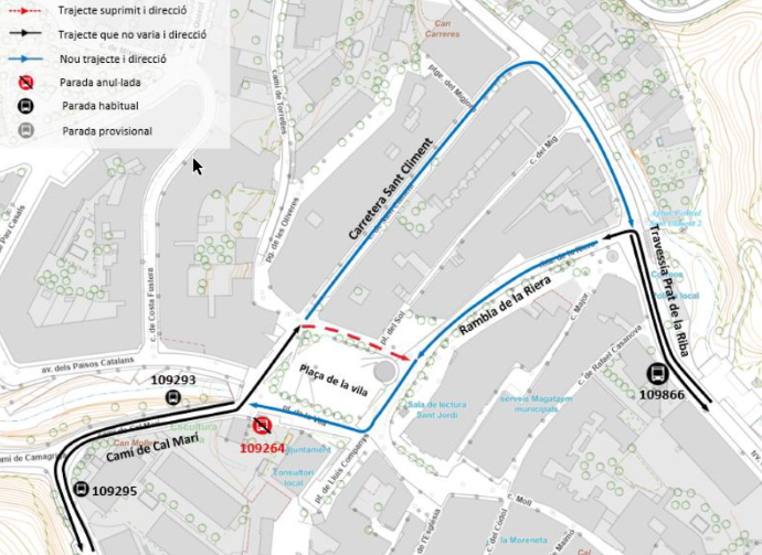 El dilluns 20 d'octubre a les 07:00 i fins el dimecres 22 d'octubre de 2025 a les 23:00 aproximadament, es modifica provisionalment el recorregut habitual a la plaça de la Vila de Sant Climent de Llobregat a causa de obres al carrer amb l'anul·lació provisional de les parades afectades.