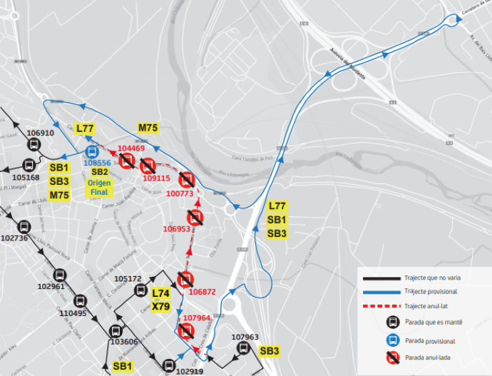 A partir de dijous 23 d'octubre de 2025 des de les 08:00 hores i fins divendres 24 d'octubre de 2025 a les 20:00 hores aproximadament, es modifica el recorregut habitual a l'avinguda Maria Girona de Sant Boi de Llobregat amb l'anul·lació provisional de les parades afectades.