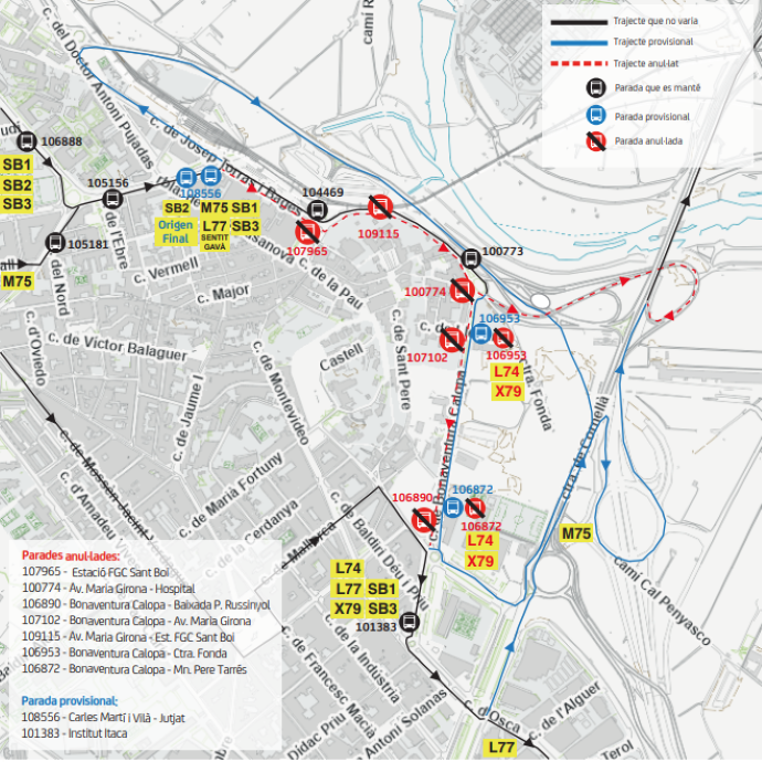 A partir de dijous 23 d'octubre de 2025 des de les 05:00 hores i fins divendres 24 d'octubre de 2025 a les 20:00 hores aproximadament, es modifica el recorregut habitual a l'avinguda Maria Girona de Sant Boi de Llobregat amb l'anul·lació provisional de les parades afectades.