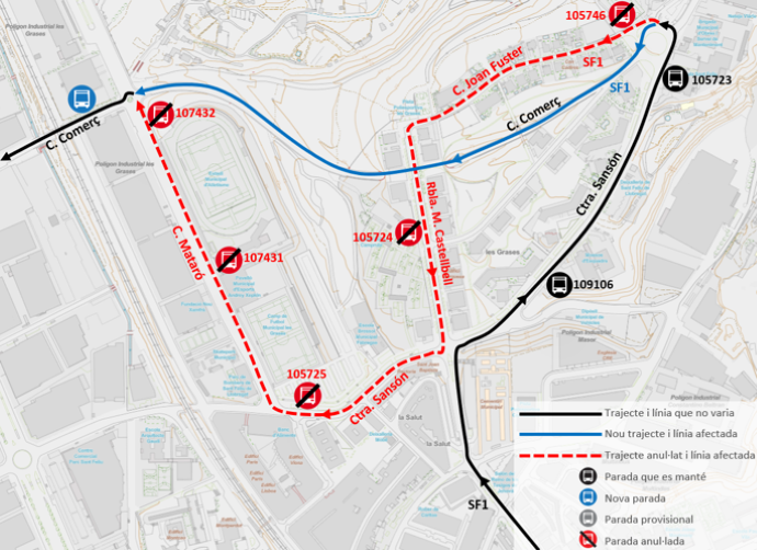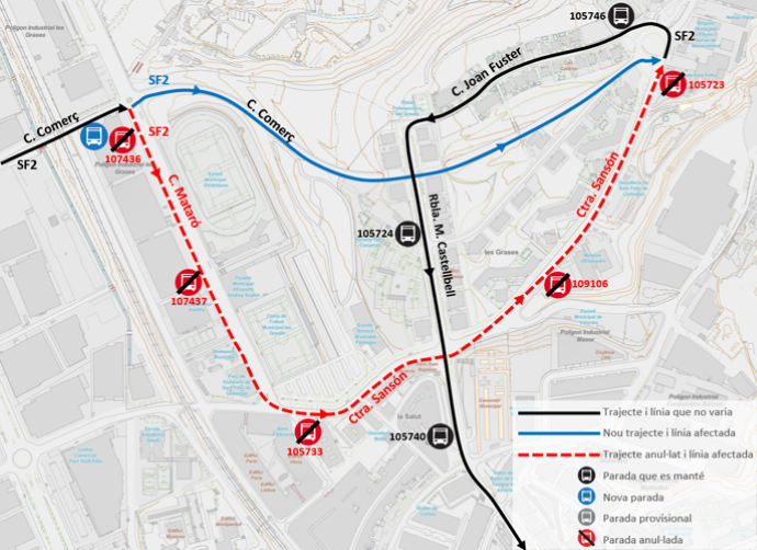 A partir de dijous 23 d'octurbre de 2025a les 07:30 hores i fins divendres 24 d’octubre de 2025 a les 15:30 hores aproximadament, es modifica el recorregut habitual a la carretera Sànson de Sant Feliu de Llobregat amb l’anul·lació provisional de les parades afectades.