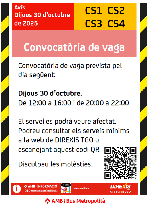 Amb motiu de la vaga convocada pel Comitè d'Empresa del personal de DIREXIS TGO el dijous 30 d’octubre de 2025 les línies diürnes que operen a Castellbisbal circularan amb serveis mínims, segons els horaris que estableix el Departament d'Empresa i Treball de la Generalitat de Catalunya: