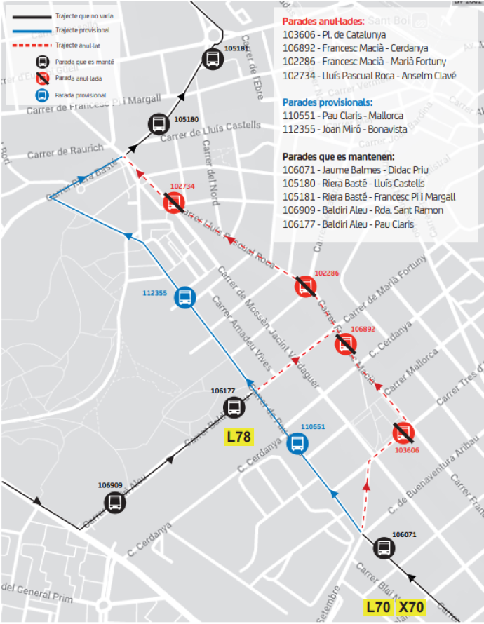 A partir del diumenge 26 d'octubre de 2025 a les 21:30 i fins a nou avís, es modifica provisionalment el recorregut habitual al carrer Pau Claris de Sant Boi de Llobregat amb l'anul·lació provisional de les parades afectades.