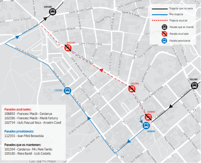 A partir del diumenge 26 d'octubre de 2025 a les 21:30 i fins a nou avís, es modifica provisionalment el recorregut habitual al carrer Lluís Pascual Roca de Sant Boi de Llobregat amb l'anul·lació provisional de les parades afectades.