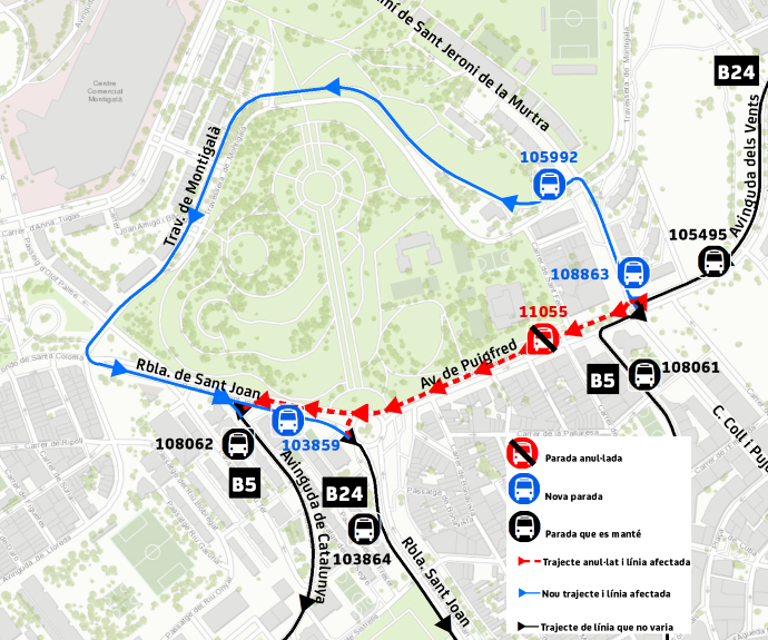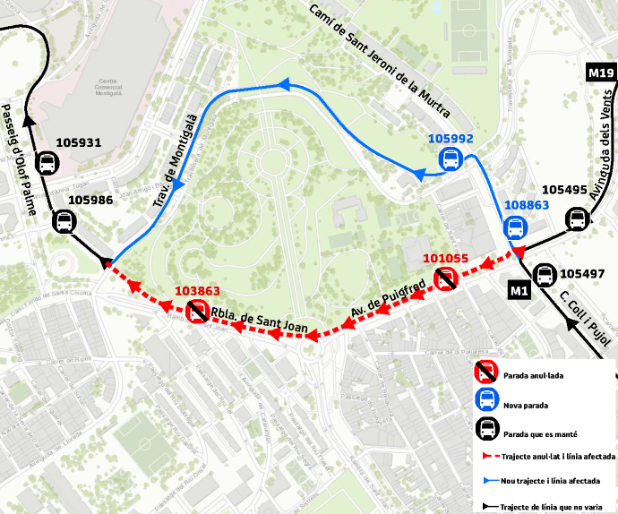 El dilluns 27 d’octubre de 2025 a les 7:00 i fins a les 15:00 aproximadament, es modifica el recorregut habitual a l’avinguda Puigfred de Badalona amb l'anul·lació provisional de les parades afectades.