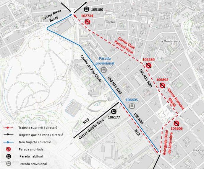 A partir del dilluns 27 d'octubre de 2025 a les 6:30 i fins a nou avís, es modifica provisionalment el recorregut habitual al carrer Lluís Pascual Roca de Sant Boi de Llobregat amb l'anul·lació provisional de les parades afectades.
