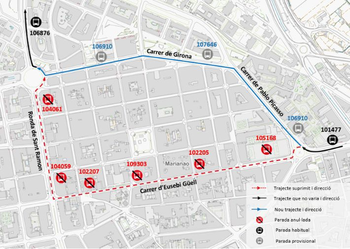 El dimarts 28 d'octubre i dimecres 29 d'octubre de 2025 a les 21:30 i fins a les 6:30 aproximadament, es modifica provisionalment el recorregut habitual al carrer Eusebi Güell de Sant Boi de Llobregat a causa de l'instal·lació de l’enllumenat Nadalenc amb l'anul·lació provisional de les parades afectades.