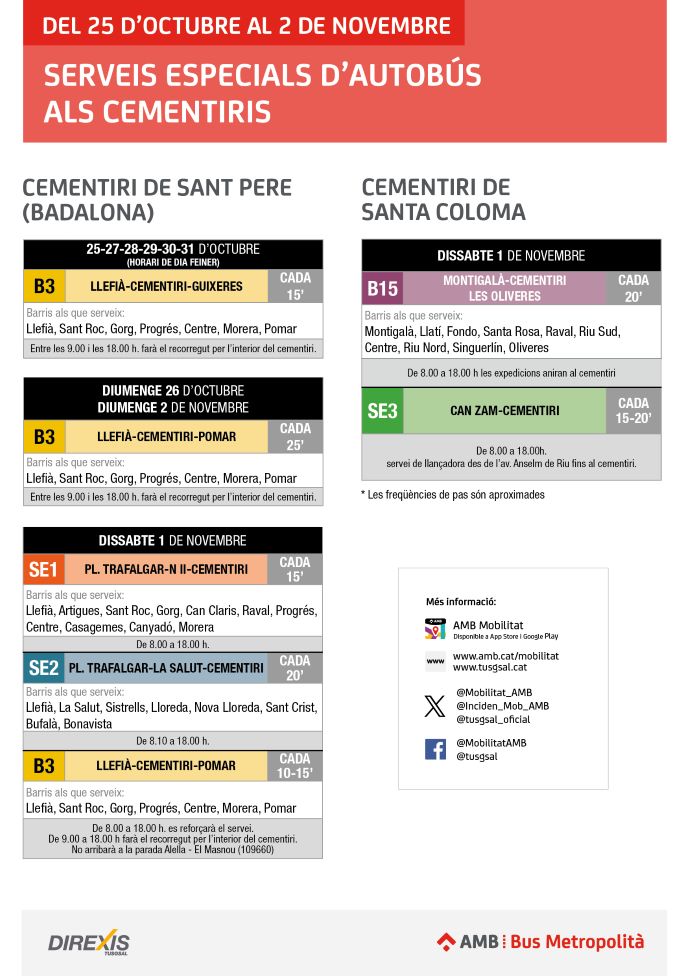 Serveis especials d'autobús als cementiris de Badalona i Santa Coloma a causa de Tots Sants Detall de l'alteració Quan?: Dissabte 25.10.2025 Línies afectades: B15 B3 Municipis afectats: Badalona - Santa Coloma de Gramenet Descripció A partir de dissabte 25 d'octubre i fins a diumenge 2 de novembre de 2025, les línies faran serveis especials de bus als cementiris a causa de Tots Sants. Tal i com s'indica a continuació: Arxius adjunts: serveis especials_102025.jpg serveis especials_102025_badalona.jpg Tornar