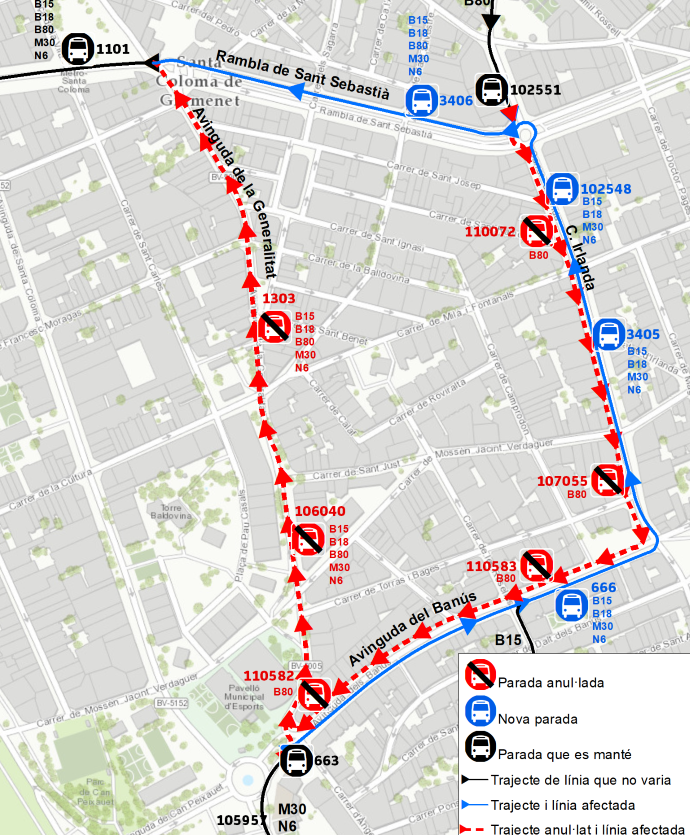 El diumenge 26 d’octubre a les 20:00 i fins el dilluns 27 d’octubre de 2025 a les 5:00 aproximadament, es modifica el recorregut habitual a l’avinguda de la Generalitat de Santa Coloma de Gramenet a causa de l'instal·lació de l’enllumenat Nadalenc amb l'anul·lació provisional de les parades afectades.