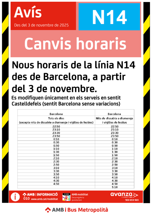 A partir de dilluns 3 de novembre de 2025 i de manera definitiva. es modifiquen els horaris de la linia sentit Castelldefels (sentit Barcelona sense variacions) tal i com s'indica: