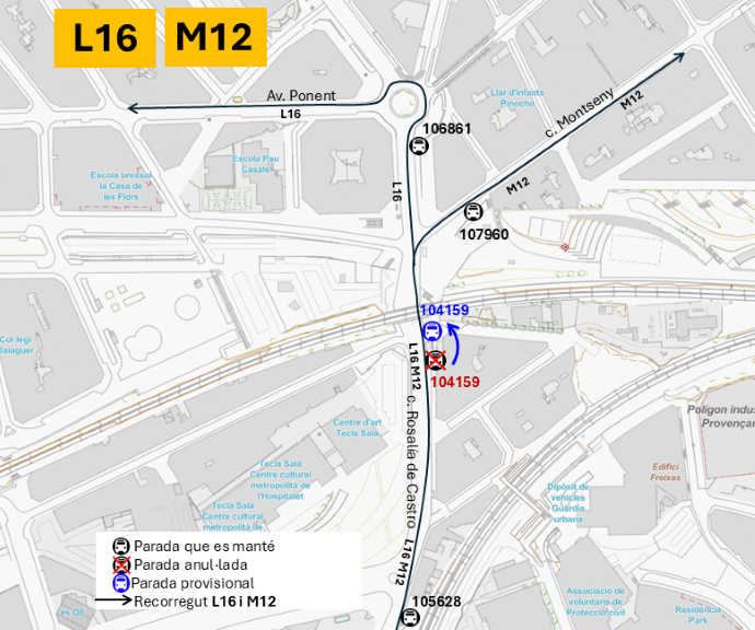 A partir de dimarts 28 d'octubre de 2025 a les 11:00 i i fins a nou avís, es trasllada provisionalment la parada Centre Cultural Tecla Sala de l'Hospitalet de Llobregat uns metres tal i com s'indica al plànol següent: