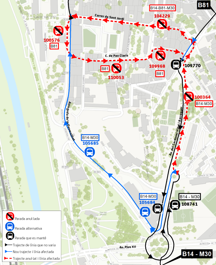 A partir de diumenge 9 de novembre de 2025 des de les 10:00 hores i fins a les 12:00 hores aproximadament, es modifica el recorregut habitual al carrer Sant Jordi de Santa Coloma de Gramenet amb l’anul·lació provisional de les parades afectades.