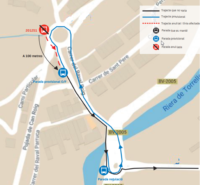 A partir de dilluns 18 de desembre de 2023 i fins a nou avís, es trasllada provisionalment la parada Raval Roig de Torrelles de Llobregat uns metres tal i com s'indica al plànol següent: