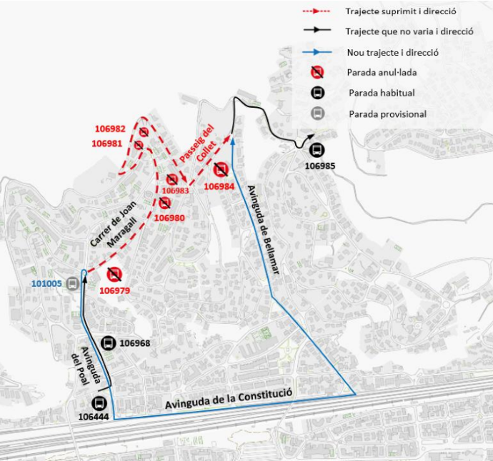 El dilluns 13 d'octubre de 2025 a les 10:30 i fins a nou avís, es modifica provisionalment el recorregut habitual al passeig Collet de Castelldefels a causa de treballs al carrer amb l'anul·lació provisional de les parades afectades.