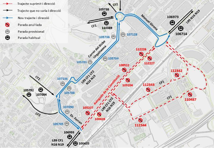 A partir de dimarts 14 d'octubre de 2025 des de les 22:00 hores i fins dimecres 15 d'octubre de 2025 a les 05:00 hores aproximadament, es modifica el recorregut habitual a l'avinguda Constitució de Castelldefels amb l'anul·lació provisional de les parades afectades.