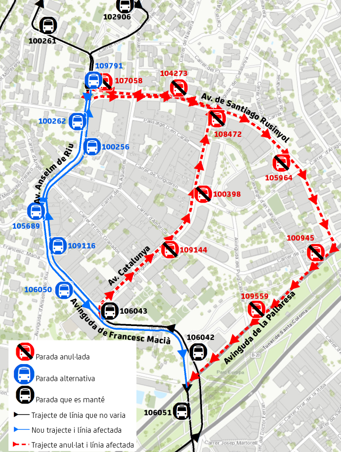 A partir de diumenge 19 d’octubre de 2025 des de les 08.00 hores i fins a les 16.00 hores aproximadament, es modificarà el recorregut habitual al carrer Santiago Rusiño de Santa Coloma de Gramenet amb l'anul·lació provisional de les parades afectades.