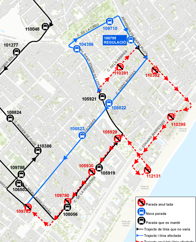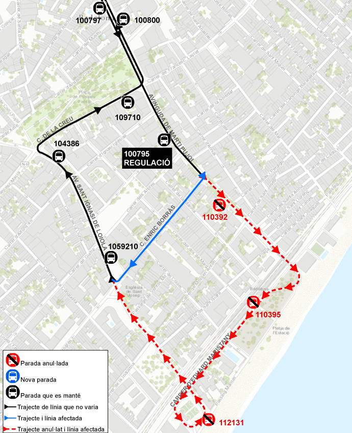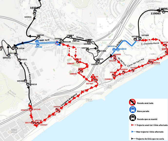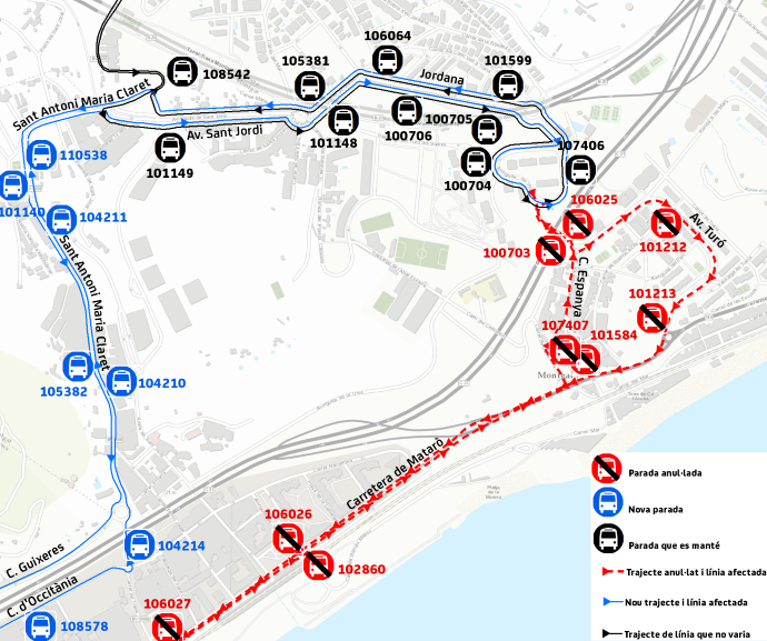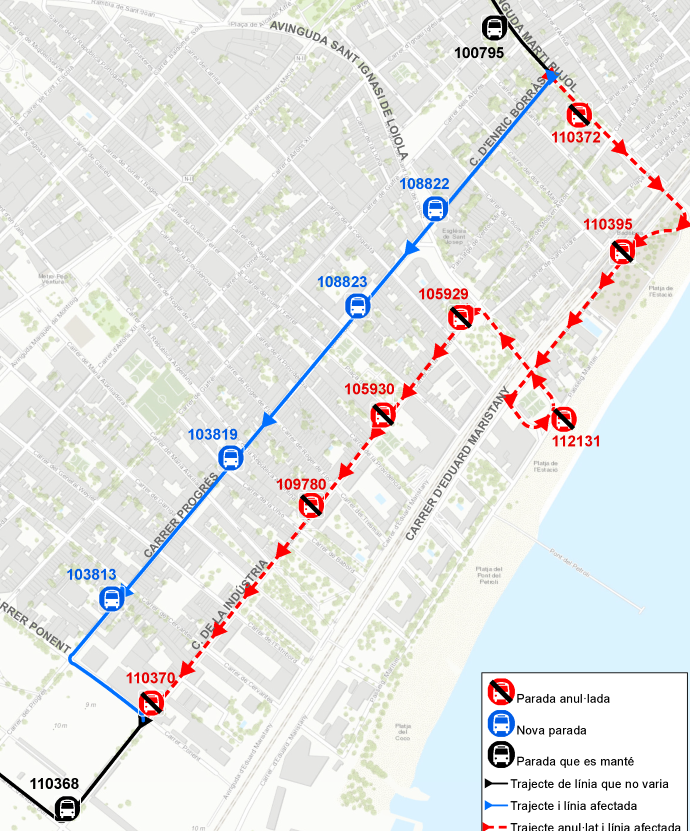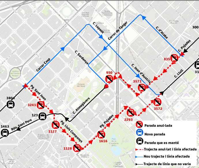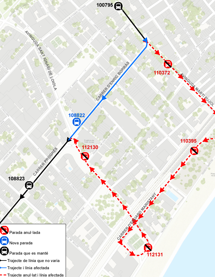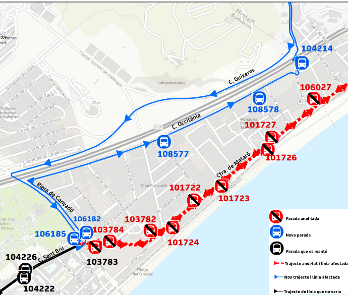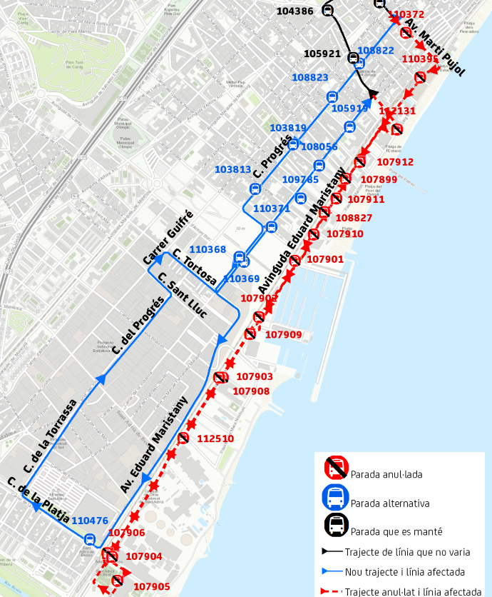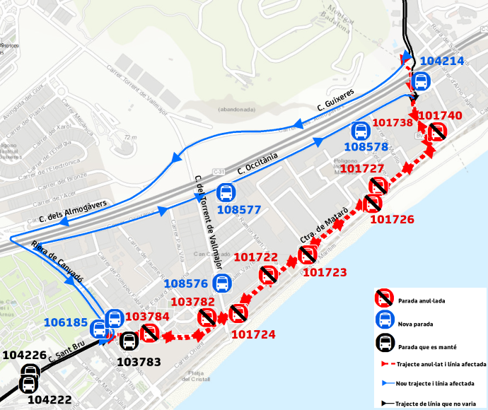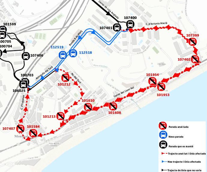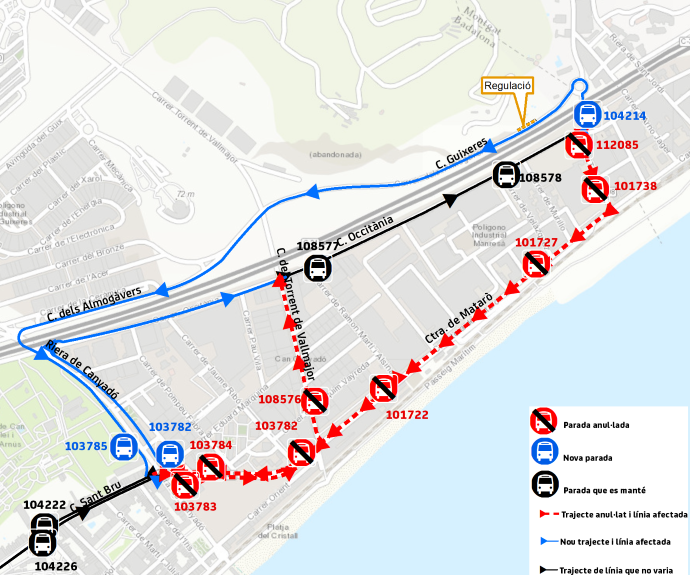 El diumenge 26 d'octubre de 2025 a les 7:00 i fins a les 14:30 aproximadament, es modifica el recorregut habitual a Barcelona, Badalona, Sant Adrià i Montgat a causa del Triatló Barcelona amb l'anul·lació provisional de les parades afectades.