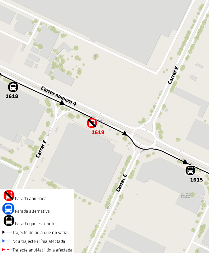 A partir de dilluns 3 de novembre de 2025 a les 22:00 hores i fins nou avís, s'anul·la provisionalment la parada Carrer número 4 - Carrer E de Barcelona.