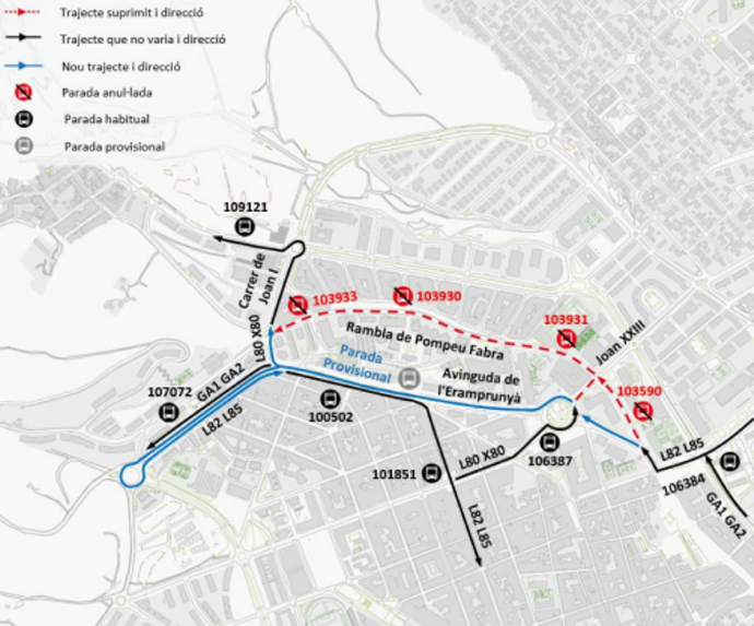 El dimecres 5 de novembre de 2025 a les 10:00 i fins a les 15:00 aproximadament, es modifica provisionalment el recorregut habitual a la Rambla de Pompeu Fabra de Gavà a causa de l'instal·lació de l’enllumenat Nadalenc amb l'anul·lació provisional de les parades afectades.