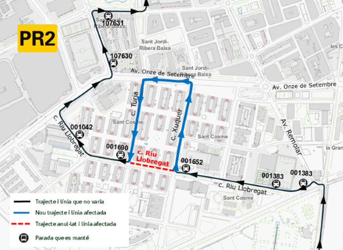 A partir de dimecres 5 de novembre de 2025 des de les 09:30 hores i fins a les 14:00 hores aproximadament, es modifica el recorregut habitual al carrer Riu Llobregat del Prat de Llobregat sense afectació a parades.