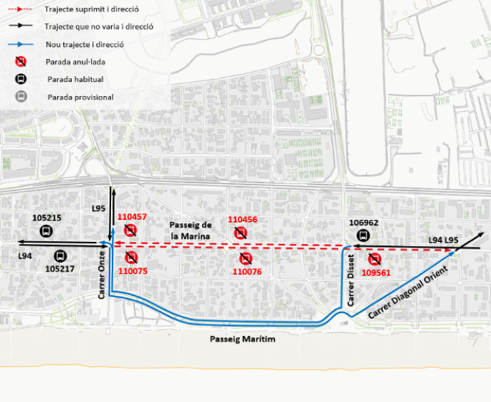 A partir de dimecres 5 de novembre de 2025 des de les 10:00 hores i fins a les 13:30 hores aproximadament, es modifica el recorregut habitual al passeig de la Marina de Castelldefels amb l'anul·lació provisional de les parades afectades.