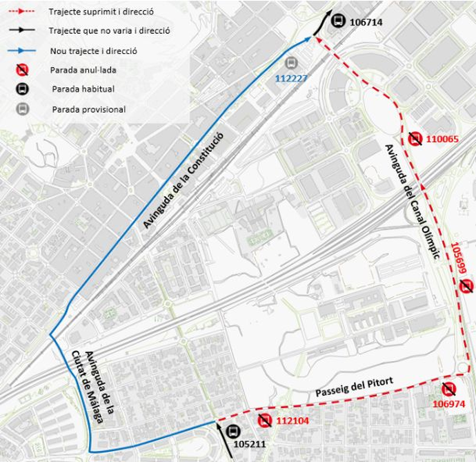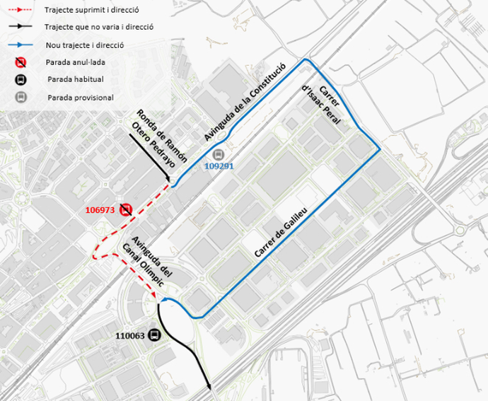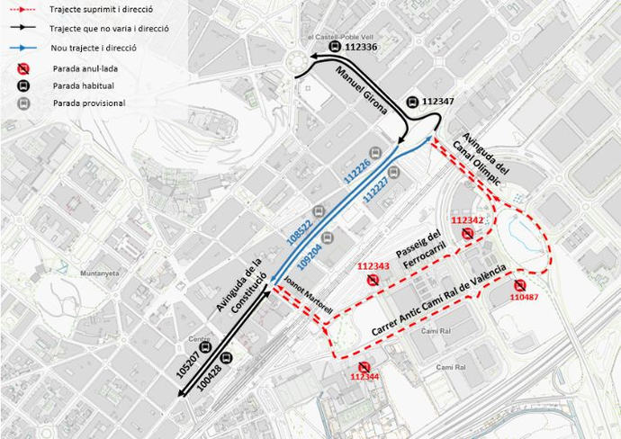 El dijous 6 de novembre i el divendres 7 de novembre de 2025 a les 21:00 i fins a les 06:00 aproximadament, es modifica provisionalment el recorregut habitual al pont del Canal Olímpic de Castelldefels a causa de treballs d'asfaltat amb l'anul·lació provisional de les parades afectades.